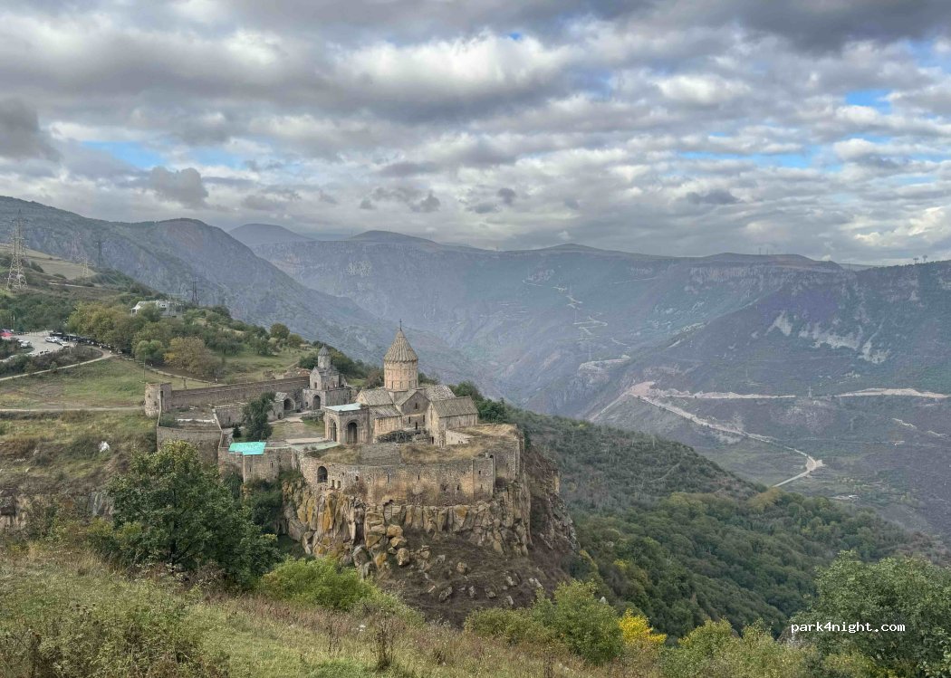 Petite plate-forme panoramique en dessous de la route. Surface sablonneuse. Très belle vue sur le monastère de Tatev et les montagnes environnantes.