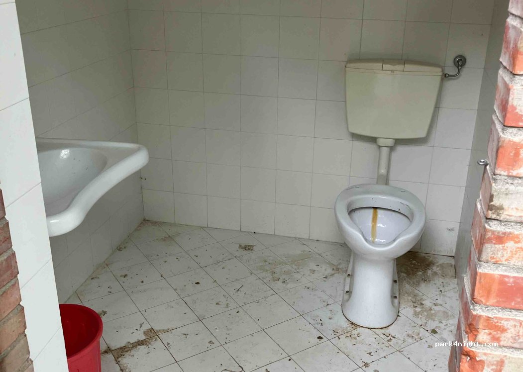 Wir haben hier eine sehr ruhige Nacht verbracht. 2 Toiletten mit Warmwasser und Steckdosen direkt vor Ort. WC und Waschbecken sauber, nur viel Laub auf dem Boden. Großer Spielplatz nebenan. Morgens kam die Müllabfuhr vorbei.