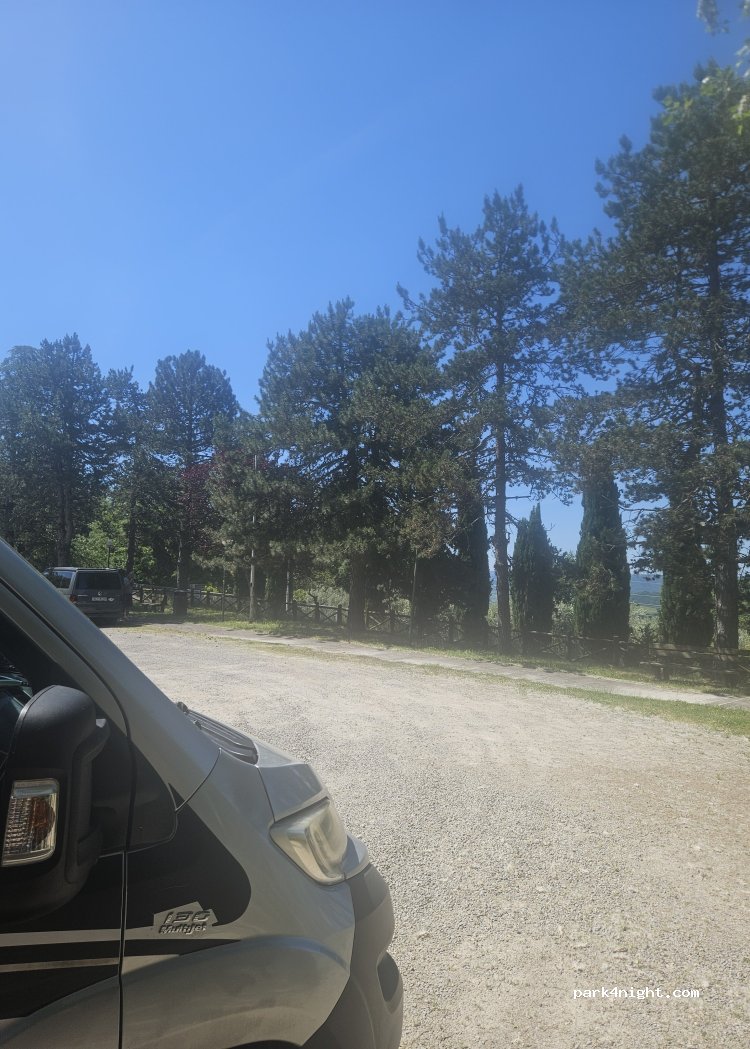 Nice and free camper area, there you can fill clean water and empty black and grey waters. There is a park for children, wc (but quite dirty) and fireplaces. Good panorama over the valley. Near there are three trekking trails and you can visit the small town of Ficulle.