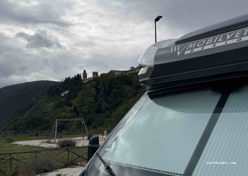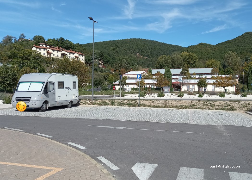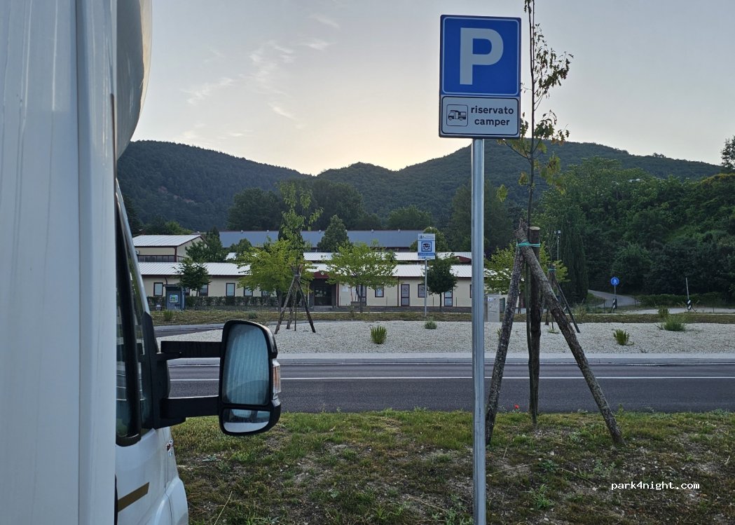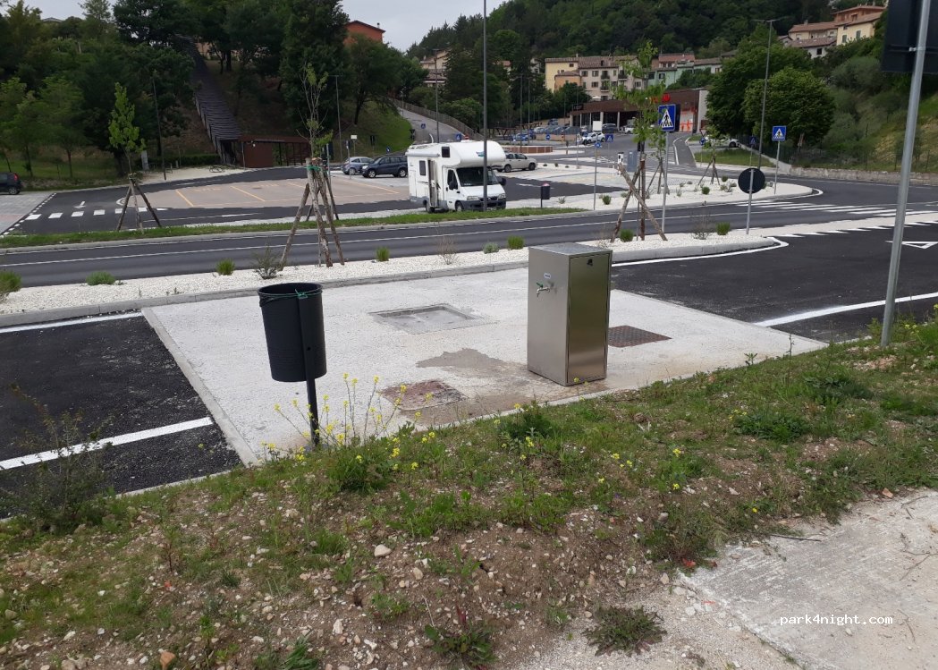 Specific parking for motorhomes. Free. Loading and unloading water. CONAD at 50 m. Center of Nocera Umbra just 5' walk away.