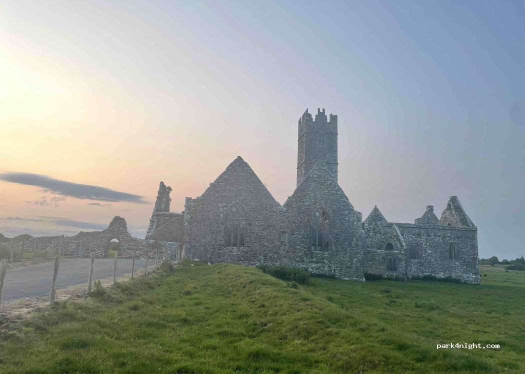 une ancienne abbaye en ruines classé monument national d'Irlande absolument magnifique ! personne sur le site, visitable gratuitement. Petit coin perdu au milieu de la prairie, calme de nuit. Quelques personnes qui viste l'abbaye dès 9h et en journée.