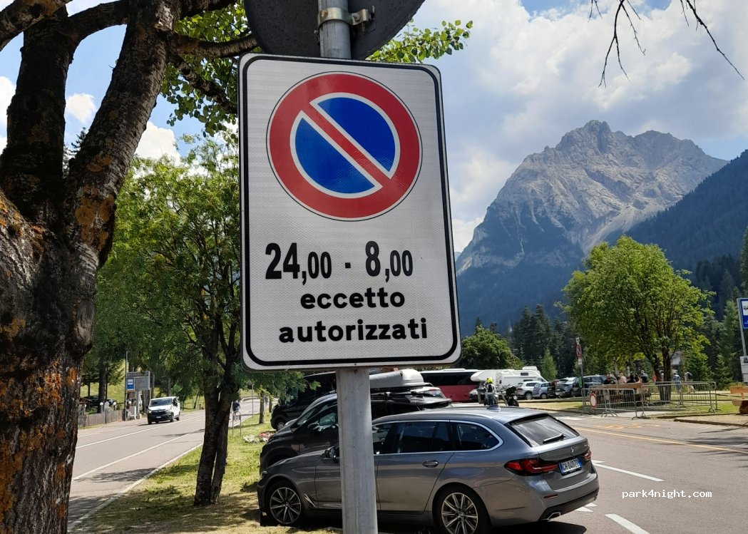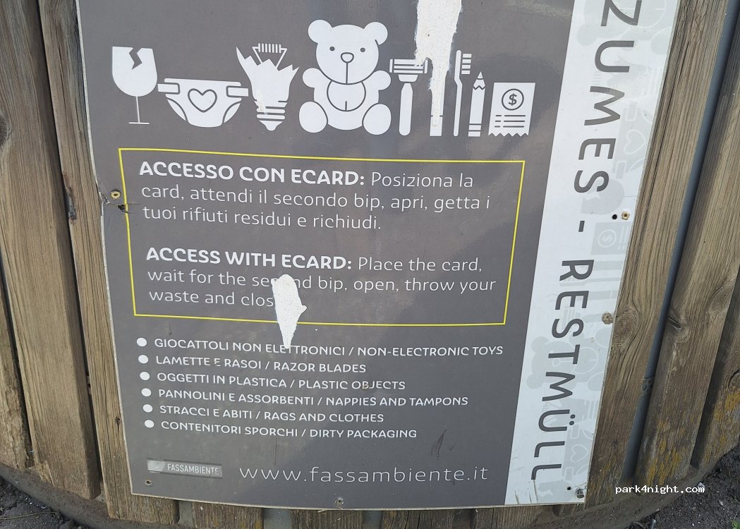 Free public parking from 8 to 24 (at night only authorized) near the center of Canazei. Quiet and safe. There are self-cleaning public toilets. Baskets and bins for separate waste collection. Tables with benches for dining. Fresh water fountain. The stalls do not allow vans longer than 540 cm. Beautiful landscape.
