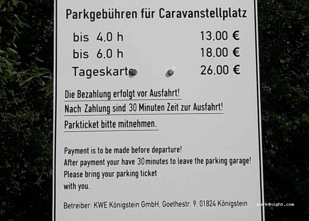 Anreise mit T5 LR und Fahrradträger im Parkhaus keine Chance. Preise sieht man erst an der Kasse, f... 4 Stunden 18 €, Tagestiket 20 € Toiletten können mit dem Parktikett genutzt werden. Preise auf der Festung ebenfalls gesalzen. 2 Bier 2 Stück Kuchen 19,60€ Evtl. in Königstein parken und mit dem Festungs-Express (Zug) hochfahren