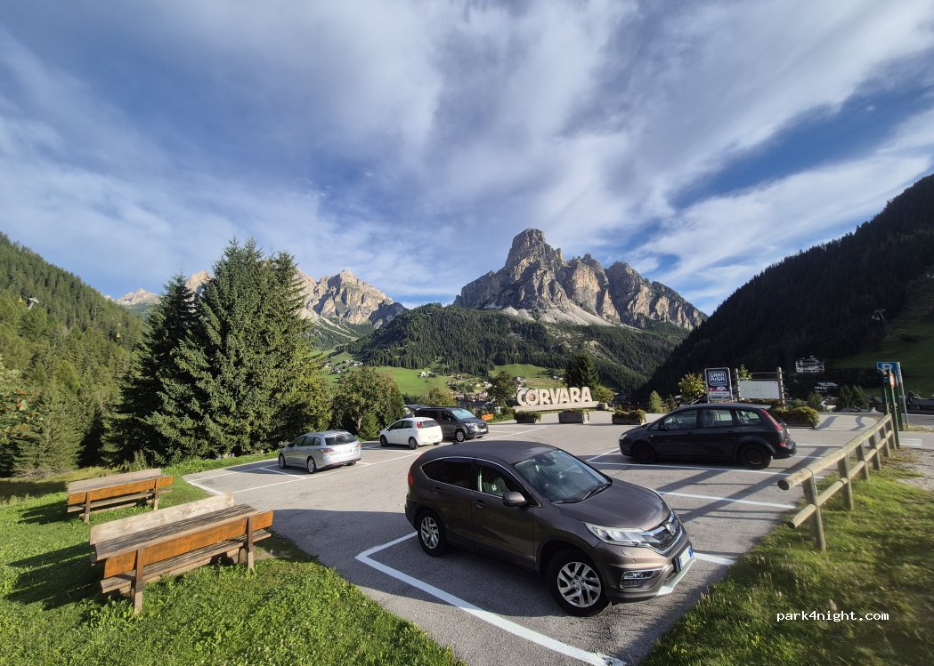 Posto molto bello, facile da raggiungere e con abbastanza posti. Il parcheggio ha anche dei tavoli con panche per mangiare. Per essere gratuito veramente ottimo. Vista spettacolare su Corvara. Unica pecca non ci sono cestini o fontanelle per l’acqua (né bagni, ma c’è vicino il bosco). Consiglio molto!