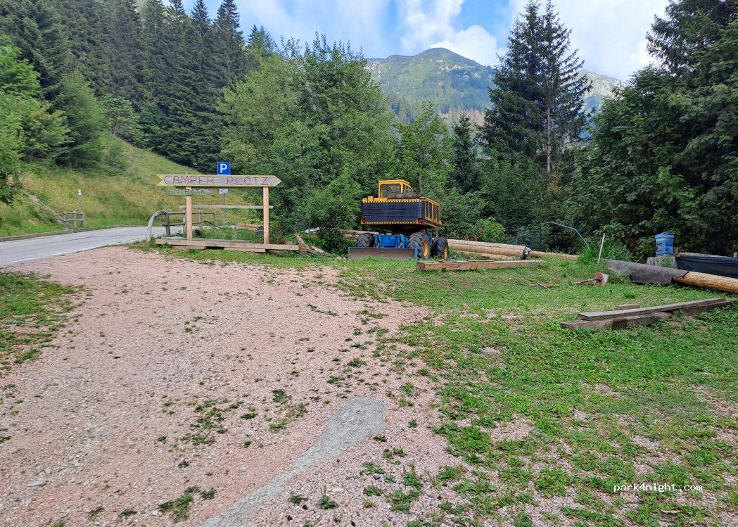 Area di sosta Camperplo'tz, ottimo punto di partenza per visitare la miniera, il lago di Erdemolo e il rifugio Sette Selle. Piazzole pianeggianti, terrazzate su prato, elettricità, carico e scarico a carico di una simpatica nonnina. Nel parcheggio appena sopra c'è un chiosco dove si possono mangiare ottimi panini e dolci tipici, solitamente di fronte ad un gazebo dove si vendono frutti di bosco, fragole e altri prodotti tipici della zona. Scendendo nel bosco si arriva al paese con tutti i servizi, supermercato, posta, bar e ristoranti, mezz'ora di cammino.
