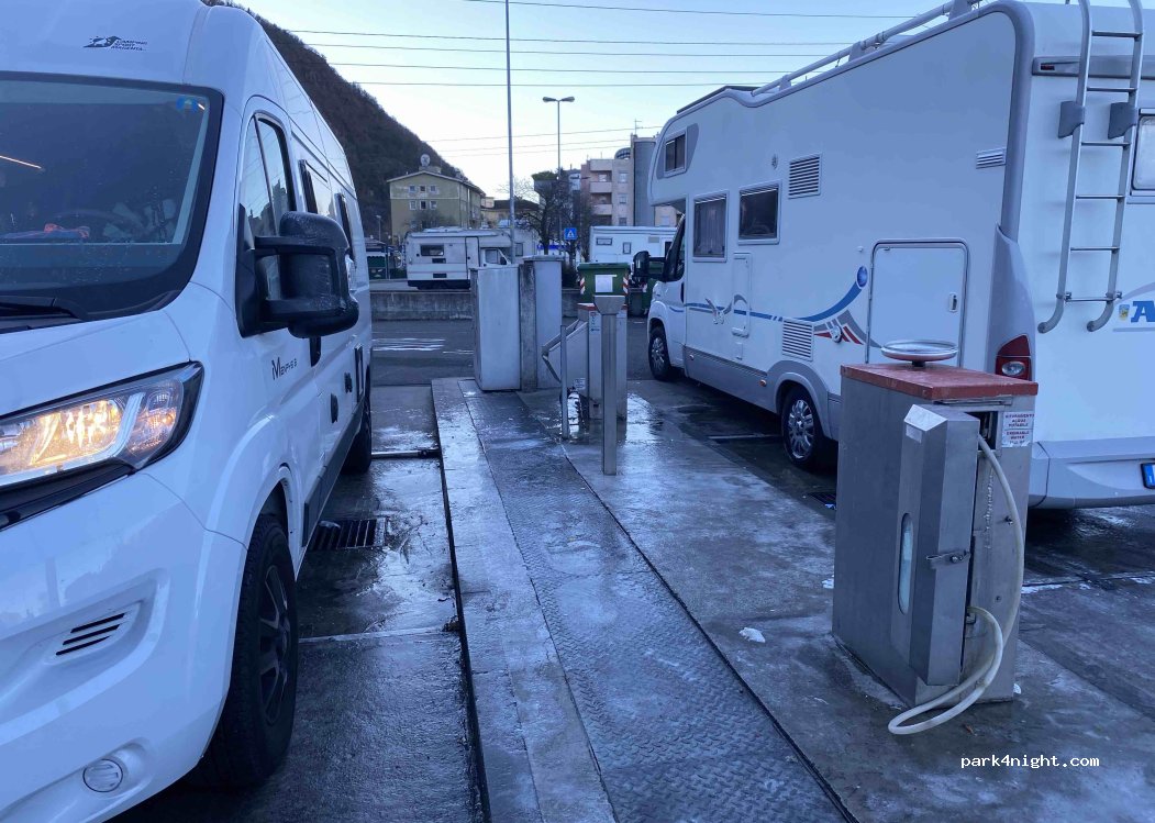 Pratica e pulita area per carico/scarico. Per il resto è un macello: -Camper stanziali. -Nessuna ombra. -Nessun cassonetto per i rifiuti. -Elettricità a pagamento ma staccata. -Vicino ad una strada molto trafficata. -Vicino allo snodo ferroviario.