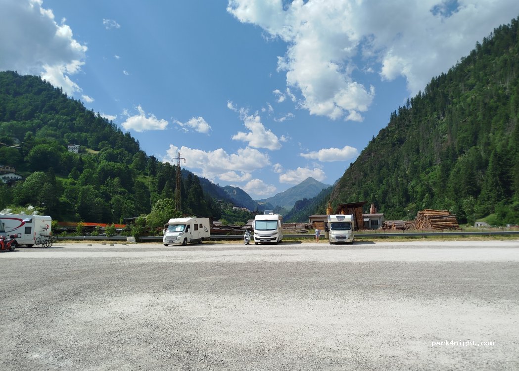 Sitio plano, cerca del pueblo y tranquilo para pasar la noche. Precio de 1€ hora de 8:30 a 18:00... noche gratis. Viendo lo que hay por Dolomitas para nosotros...no está mal