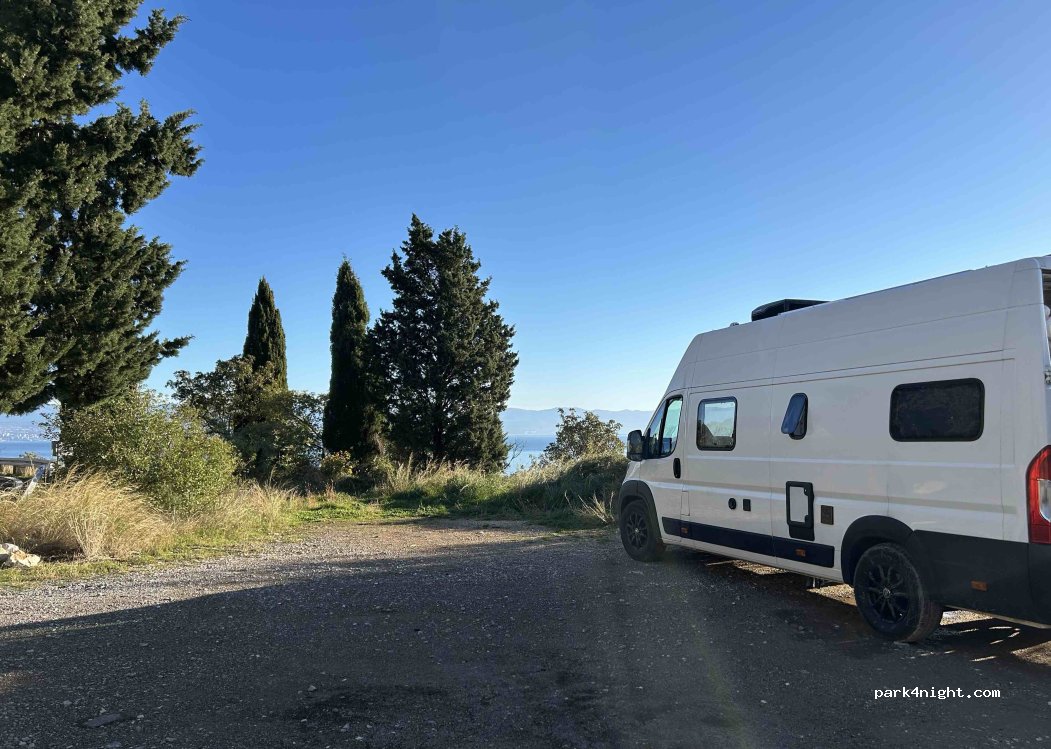 Einfacher Platz den wir uns mit ein paar Tschechen geteilt haben. Dem Info Kommentar kann ich leider gar nicht zustimmen, hier haben höchstens 4 Autos Platz. Wie bereits erwähnt liegt er direkt an einer Straße und ist dementsprechend "laut", ansonsten hat man einen netten Blick aufs Meer. Zweckmäßig aber gut :-)