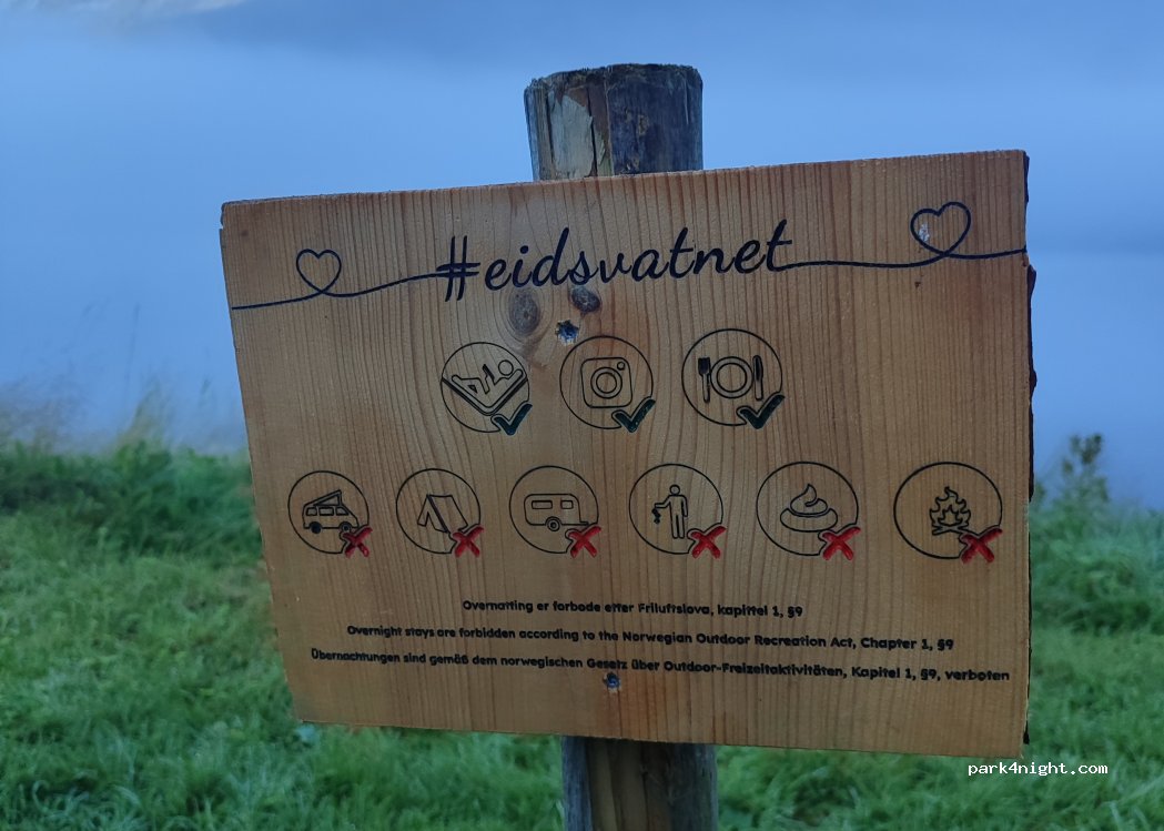 Camping here is NOT permitted, regardless if there are signs or not. Read the signs, respect the Norwegian law and support the campsites instead. The parking is an infield and according to the law camping on infield is ONLY allowed with the owners permission. Be prepared to get a visit from the police in the middle of the night if you park anywhere around the lake overnight.