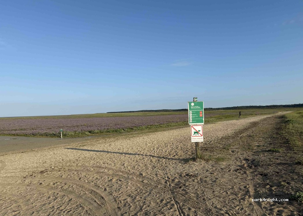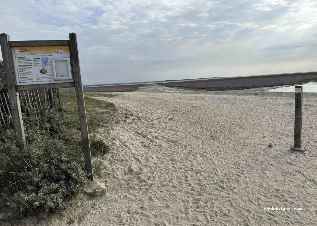 Déjà tous les véhicules peuvent accéder au PK. Stationnement bord de route d’un côté à l’ombre en attendant que les voitures libèrent le grand PK. Accessible et presque plat, aucune vue et moustiques ! Bien dormi toutefois car possibilité de se garer de façon à avoir... la tête au Nord ?. Disons que pour voir une immensité de sable et marcher c’est parfait. Peut-être revenir les jours de grandes marées pour voir de l’eau ?