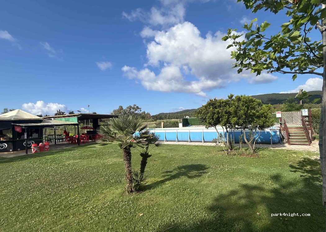 Abbiamo trascorso quattro notti e abbiamo visitato, avendo l'auto al seguito, alcune bellissime spiagge nei dintorni. L'are è molto bella, la nostra piazzola super ombreggiata, c'è una piscina esterna per rinfrescarsi, un chiosco nel giardino di fronte alla piscina e posso affermare di aver trascorso delle notti tranquille. Bagni e docce sempre puliti con presenza di sapone e carta igienica.