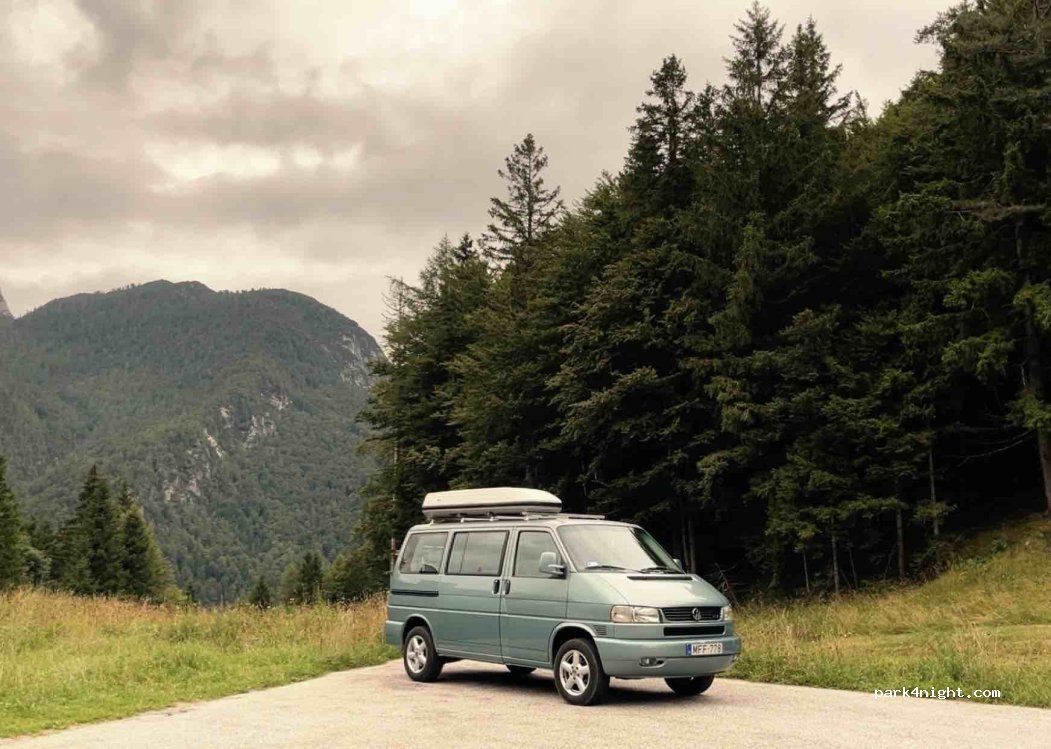 Great place to stay overnight if you don’t want to get fined in Slovenia, literally 150m from the border. Dark and next to the road, but it is quiet and discreet at night, people can barely see you if they drive by. And you can drive down to the lake’s viewpoint in the morning.