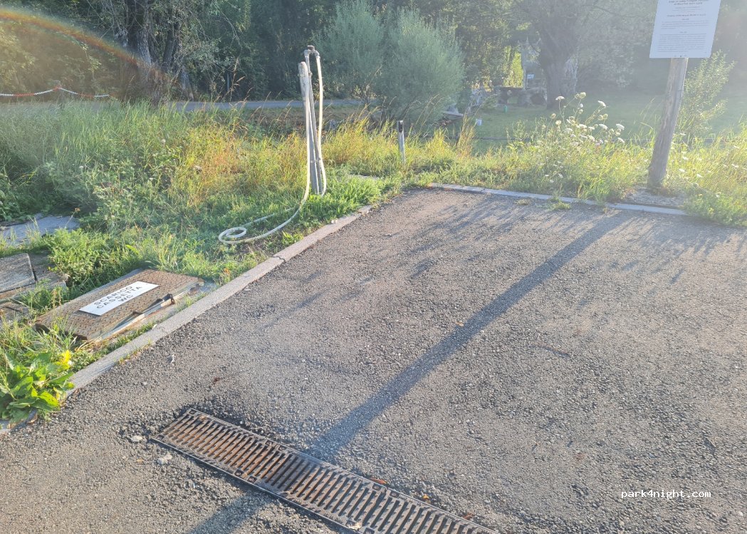 area de sosta chica. hay una barrera con un candado para entrar hay que llamar a un numero de telefono. es asfaltada tiene para descargar aguas negras y grises, agua y corriente para 4 camper. todo a pagar, no es gratis