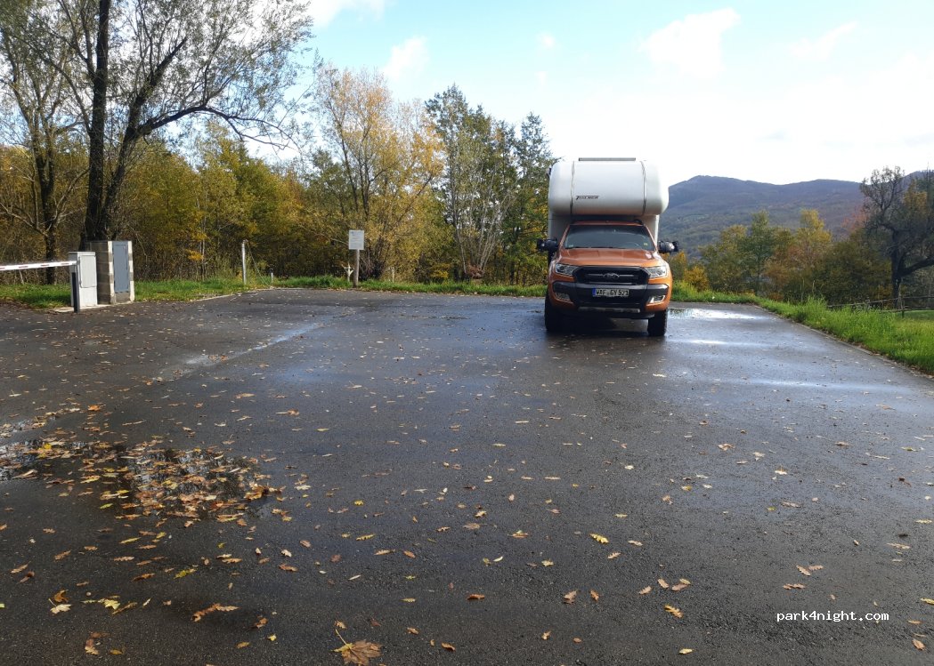 Ruhiger Rastplatz oberhalb des Ortes Monchio delle Corti. Die Bar am Eingang ist mit einem Vorhängeschloss versehen. Der Schlüssel muss im Restaurant Da Berto in der Mitte abgeholt werden. Fahren Sie nicht mit dem Wohnmobil, wenn Sie keinen Schlüssel haben, da sich große Wohnmobile nicht mit geschlossener Stange drehen lassen.