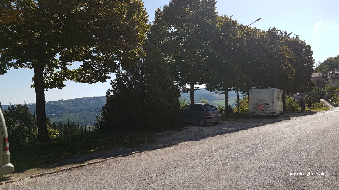 Stationnements sous les arbres le long d'une voie peu passante. Vue magnifique sur tout le village perché de Serra san Quirico. Pas de service.