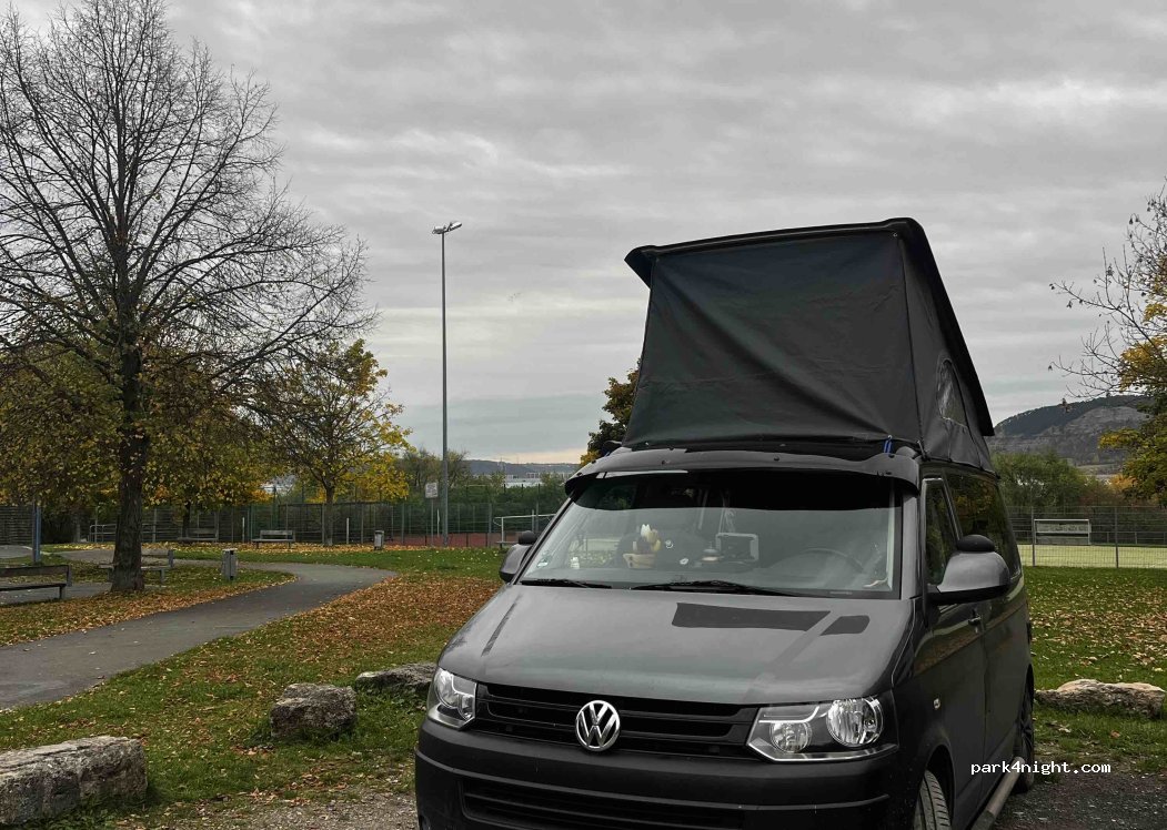 Small parking lot on the edge of a nature reserve next to a playground and sports facilities. Ideal for one night - without installations. During the day well attended facility, in the evening a few athletes in the square next door and some dog owners.