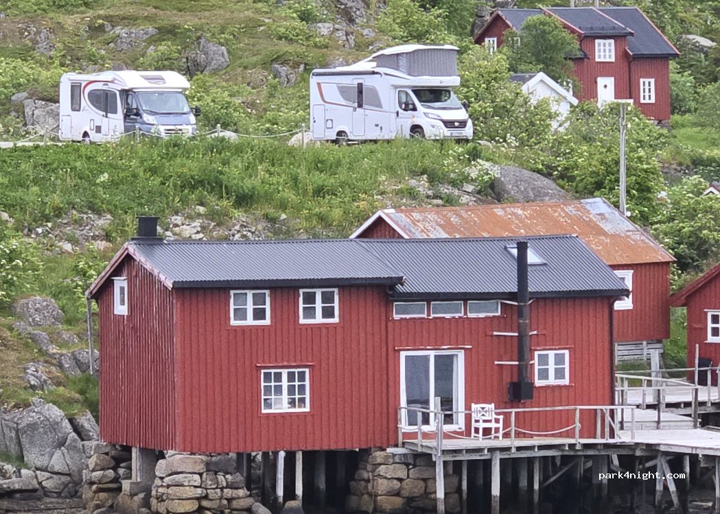 Parking juste avant la digue de l’île , règlement au restaurant sur la route. Pratique pour aller faire la rando de ballstad ! À côté des séchoirs à morue. Aucun services.