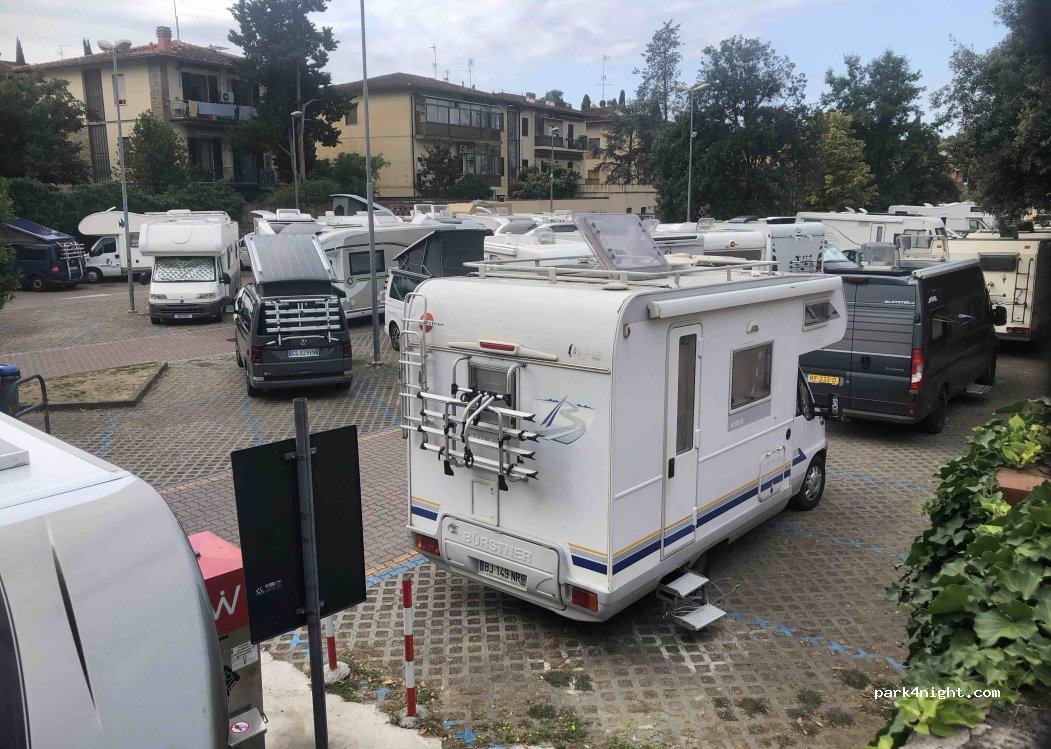Parking à barrière mais sans gardien. Point d'eau et vidange. Possibilité de sortir les chaises (officieusement !). Relativement sûr mais un camping-car s'est fait voler 2 vélos la veille de notre arrivée donc prudence. J'ai choisi de mettre le notre en plein milieu et non le long des murs. Arrêt de bus 11 (en été) et 37 pour Florence. Tickets au café à 100 m au-dessus du parking.