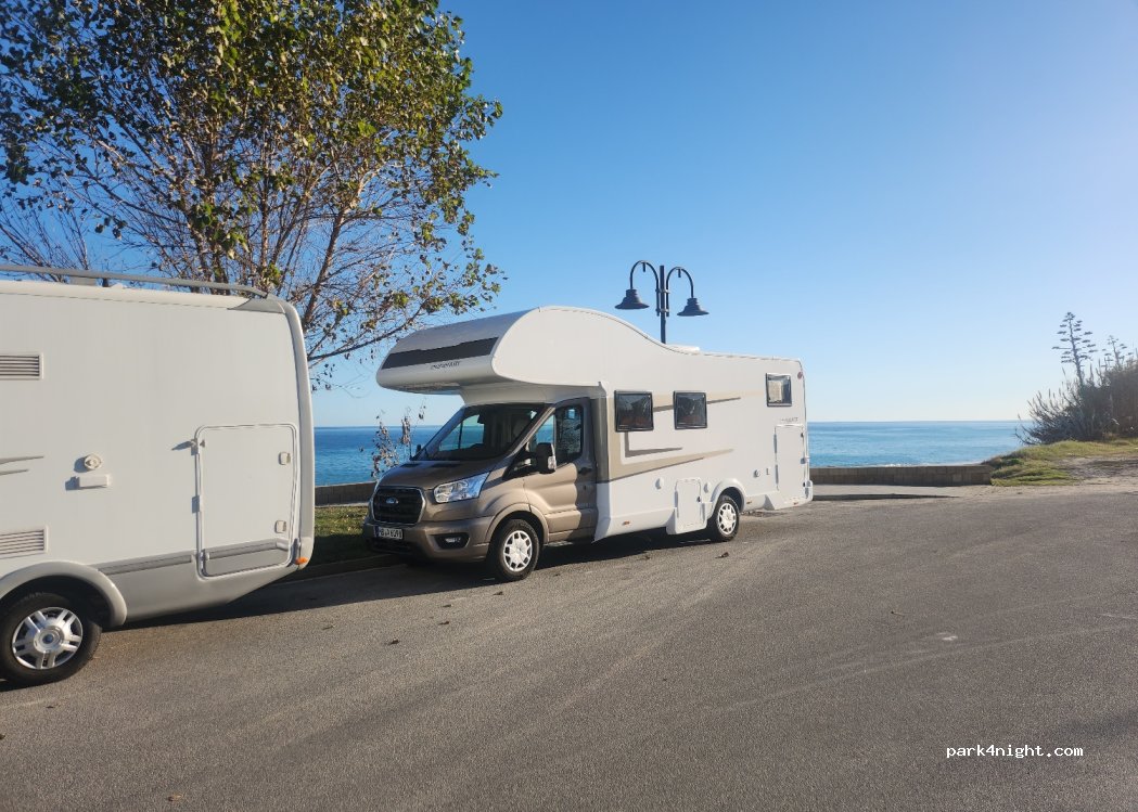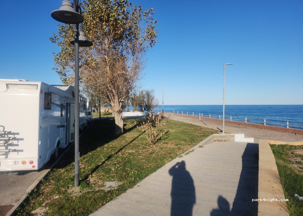 Parking day free night on hard. Between road and sea Very quiet at night (October). supermarket 10 m. Small sand pebble beach at 20 m. Many days pass. Good for one night