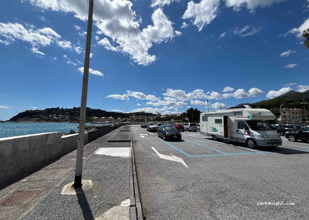 je viens d'y passer une nuit tranquille vue sur la mer et sur le golfe de GENES tarif parking 1,5 euros chaque heure et ensuite 1 euros pour la quatrième heure Bon parking en prévision d'embarquement sur Ferry a GENES ou après un débarquement les parkings qui sont indiqués avant celui ci en venant de GENES sont soit trop petit ou bien trop près de la voie ferrée se garer face a la mer a gauche
