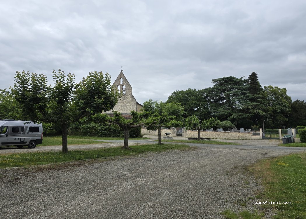Parking sans barrières, face a l eglise, plat avec des arbres, hyper tranquille, sympa pour passer une nuit