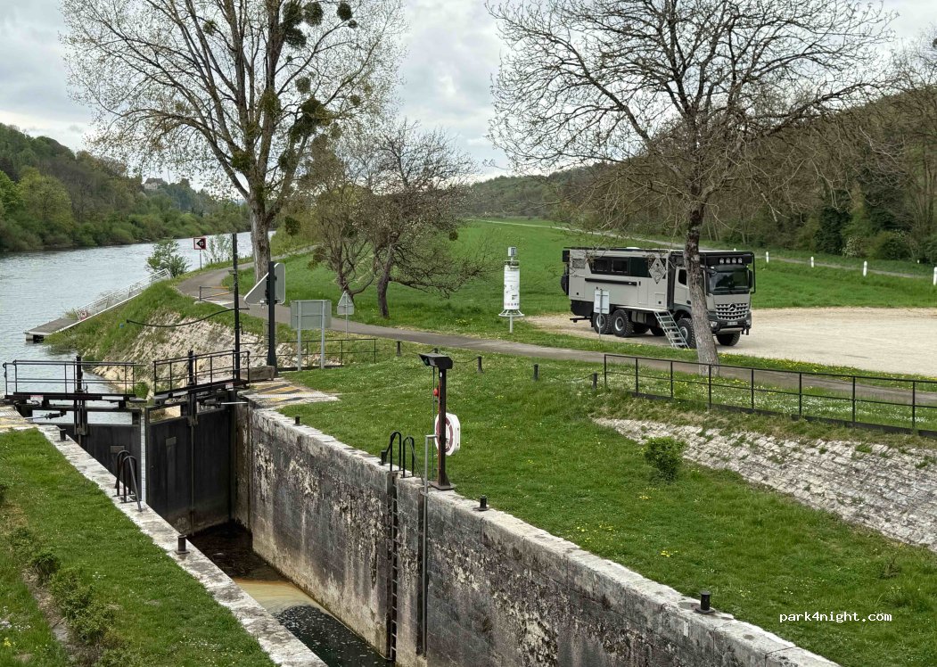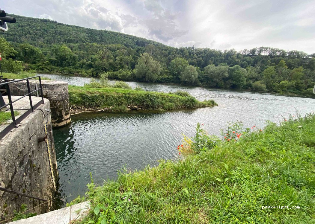 Endroit facile d'accès et au bord du Doubs. Passage de la vélo route donc idéal pour les balades avec ferme associative à deux pas. Manque de services et aucun vidage d'eau grise. Route + train à proximité mais peu de passage même en journée et nuit paisible avec bruit de l'eau.. possibilité de voir le fonctionnement de la double écluses lors de passage de péniche!
