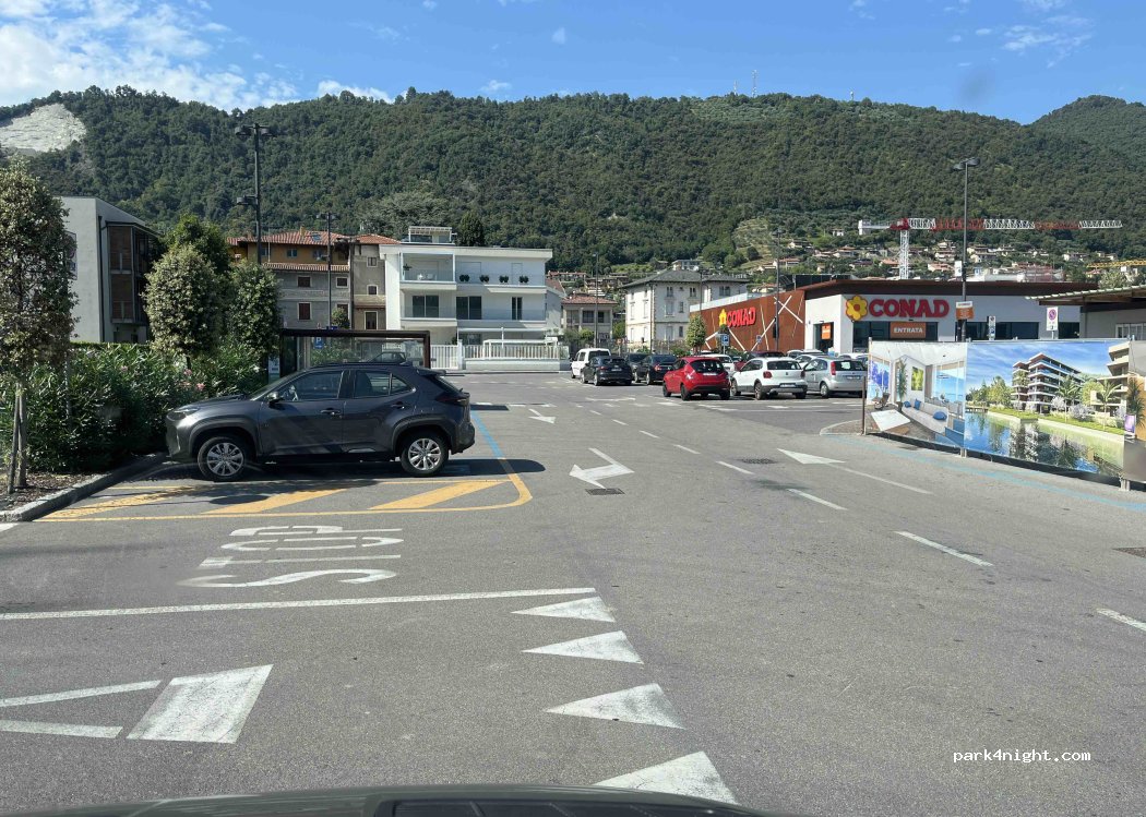 Very busy with locals who want to come to enjoy their village, and who can blame them, it’s a beautiful promenade with many bars and restaurants. This is a Conad supermarket car park that does not have any restrictions for overnight camping. Free from 8pm-8am (the car park just next door is free 11pm-9am).