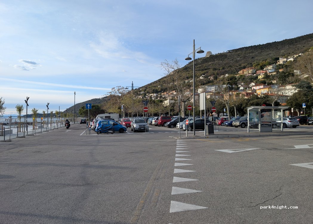 Hele goede plek dichtbij Barcola Beach en de boulevard. Zwemmen en schaduw in het park. Gen schaduw op de parkeerplaats. Gratis en dus snel vol. Campers mogen van 07.00 - 21.00 uur op de daarvoor bestemde plekken parkeren. Je kunt vanaf deze parkeerplaats naar de stad lopen (60 min) of met de bus (15 min) of met de fiets (15 min). Je kunt fietsen huren op de parkeerplaats.