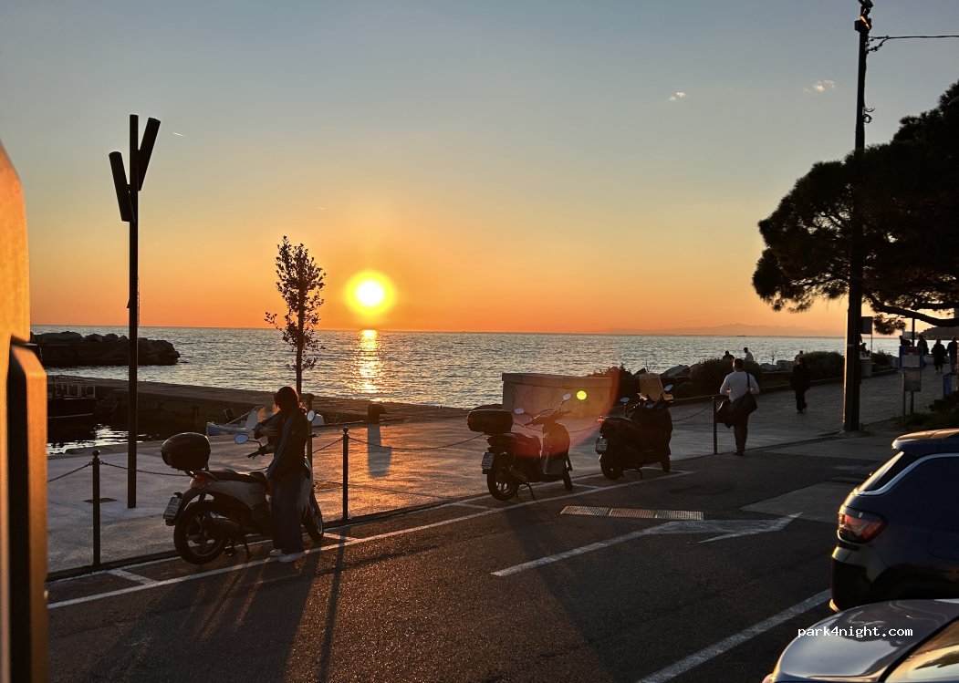 Free parking right on the marina . Room for 7.5 meter van . Swimming spot right along the length of the road. Drinking water and toilets in the park 20 meters from the car park. Cold showers on the beach 900 meters down the road towards Venice . Can stay free all day till 9pm then there is another very new car park that you can sleep only 600 down the road towards Trieste same side of the road. Motorhomes can only park in the blue parking lots €6 for 12 hours €12 for 24 hours. If you are a car or small van you can park for free.