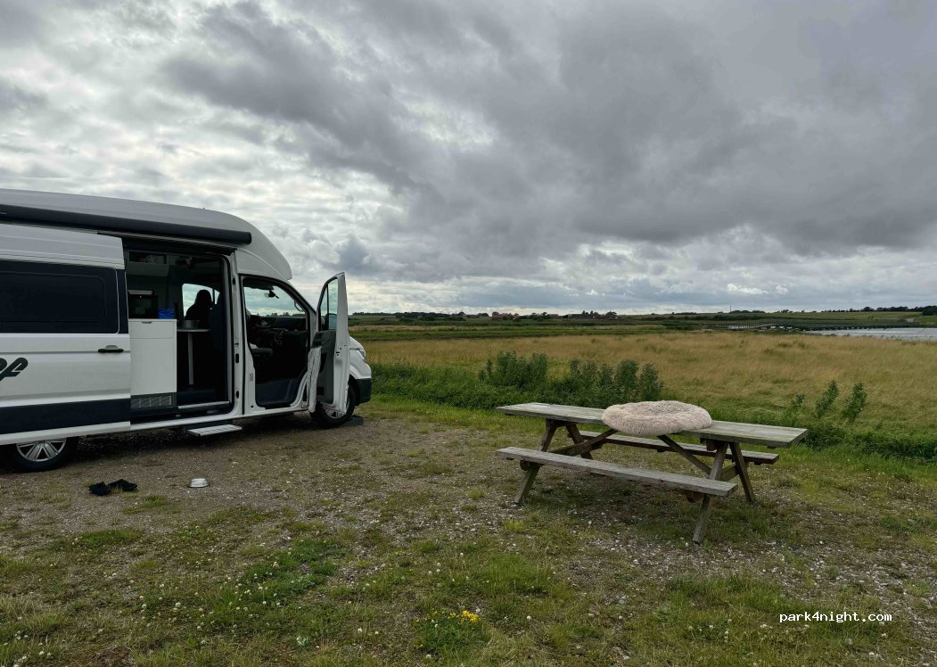Tout au bout de la route, pas de poubelle mais une table de pique-nique, absolument calme, mais exposé au vent, reposant la nuit aucun passage, à part quelques joggeurs vers 8h du matin, observation des oiseaux possible, petites balades à faire