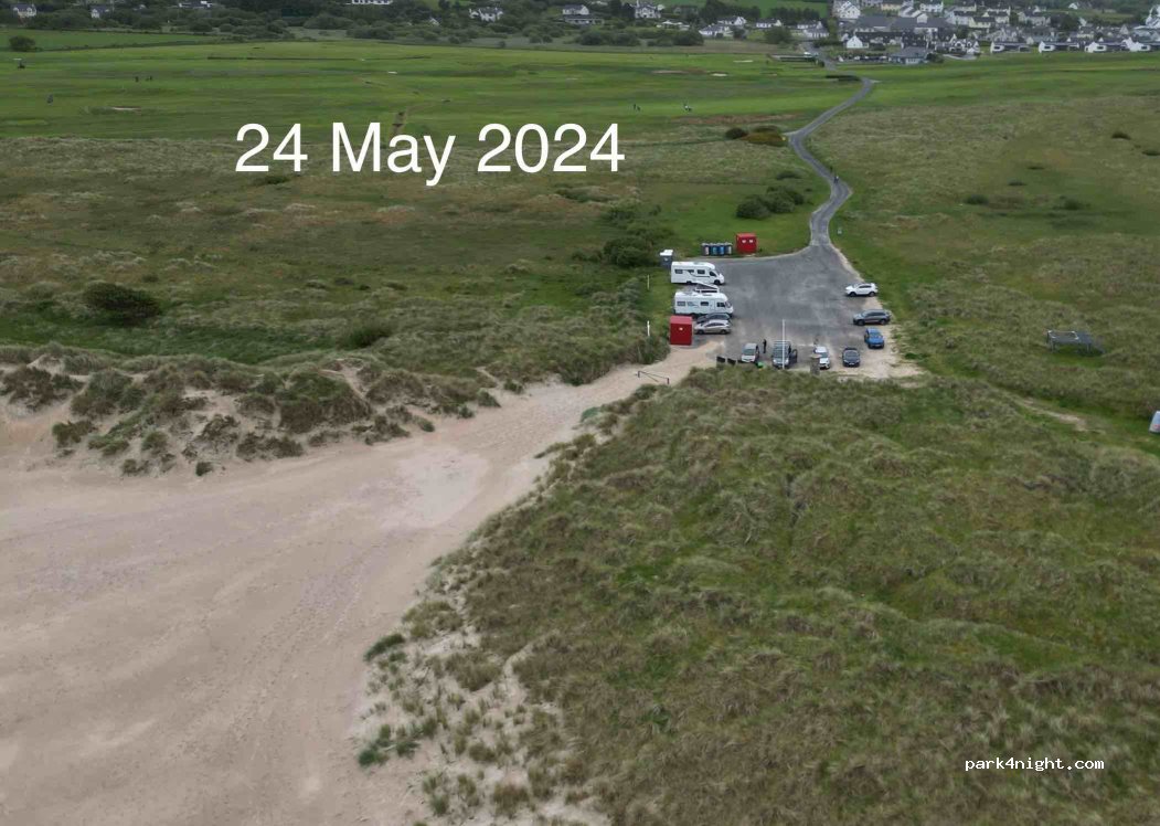 Overnight parking allowed at this very nice parking area beyond the golf club. Height barrier still open. It was very busy on the Friday night that we stayed, maybe 25 motorhomes parked up, but it might have been because there was a jazz festival weekend on in the village. Water available. Beautiful beach just 1 minute away, and several pubs/bars in the village 10 minutes walk.