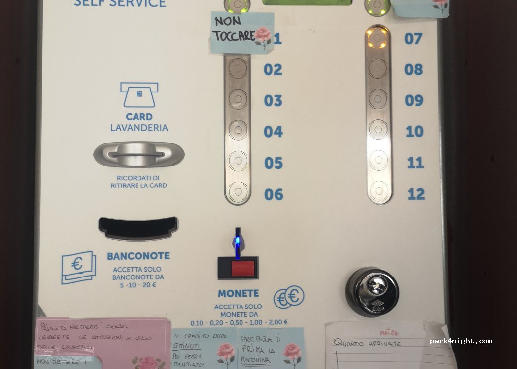 È comoda a pochi minuti a piedi dall'area sosta camper. Alcune macchine attualmente sono guaste. Il dispenser detersivi potrebbe essere vuoto, consiglio di portarsi il proprio sapone liquido. Il cambiamonete non funziona, ma le macchine danno il resto
