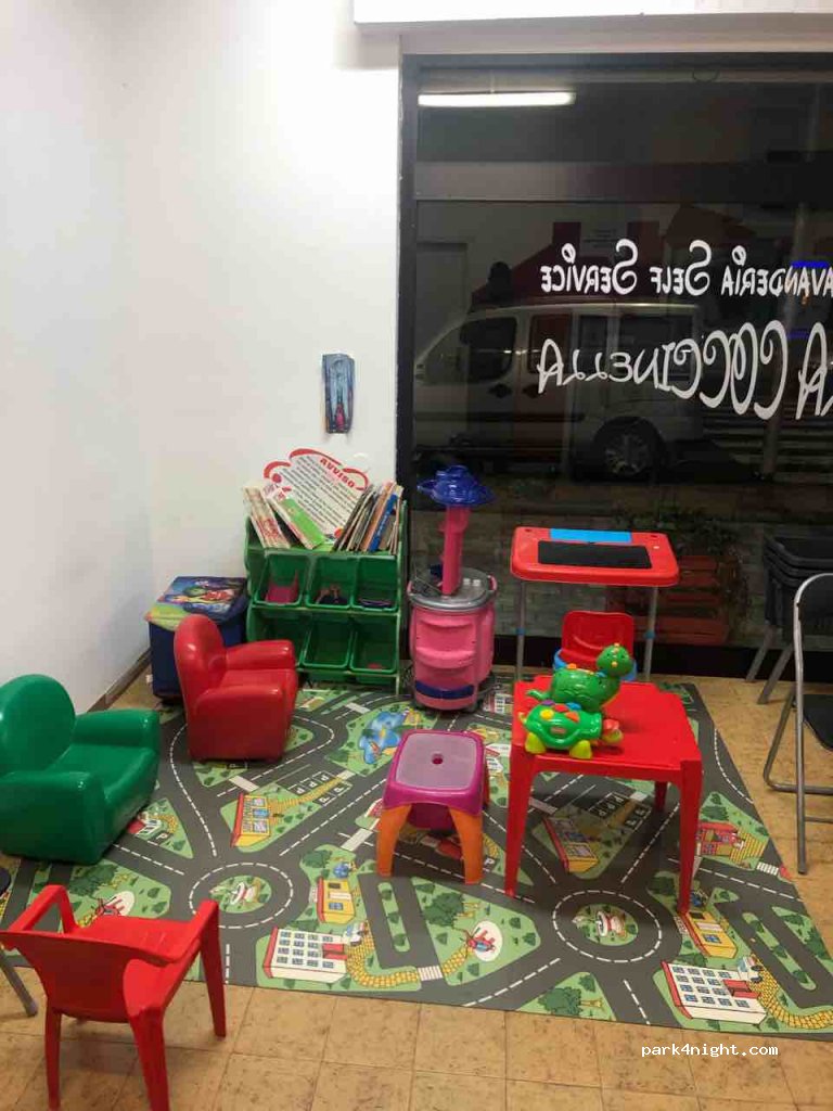 “Lavanderia Self Service La Cuccinella” laundrette; drying, Children's play area, snack machine, coffee machine, money changer.