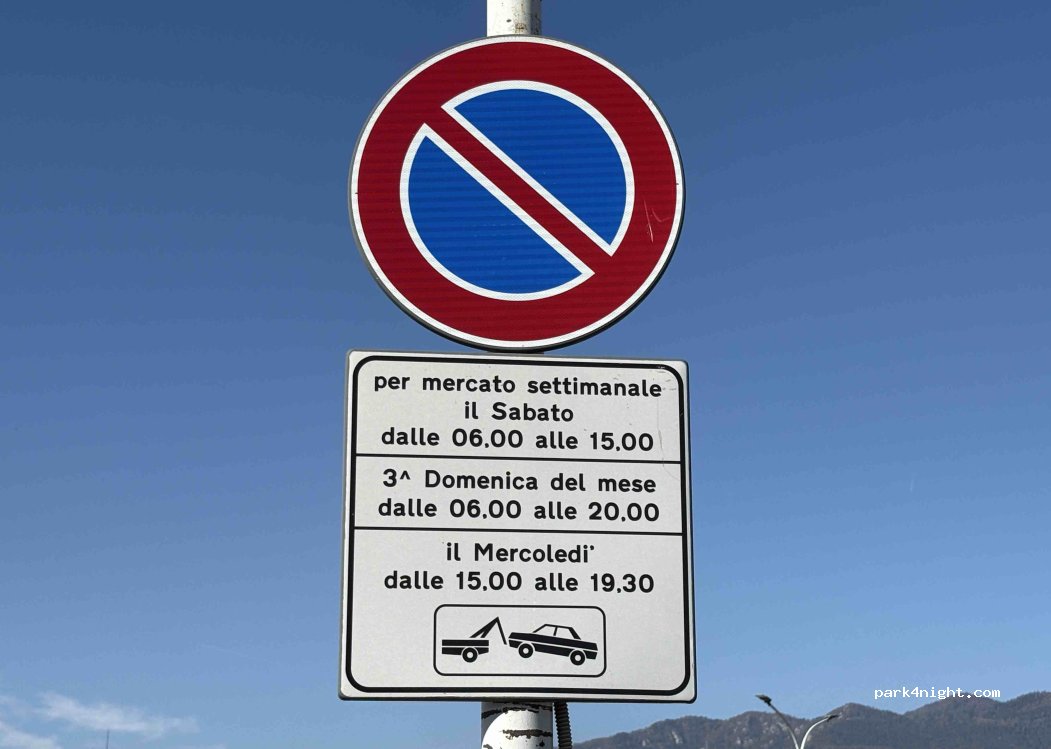 La sosta è vietata a causa del mercato settimanale la domenica dalle 06:00 alle 15:00, la terza domenica del mese dalle 06:00 alle 20:00 e il mercoledì dalle 15:00 alle 19:30.
