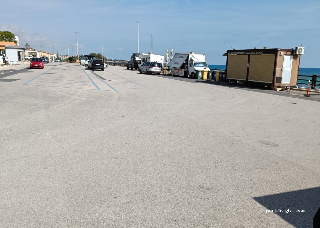 Il parcheggio è molto grande e dalla ringhiera si può ammirare il mare. Anche se non è permesso pernottare (come spesso succede) ci siamo comunque fermate per la notte e nessuno ci ha detto niente. Eravamo l’unico camper. Quando ci siamo svegliate è passato un signore con un furgoncino che vendeva briosche e granite. La sera il posto è illuminato e ci sono alcune bancarelle che vendono da bere/mangiare.