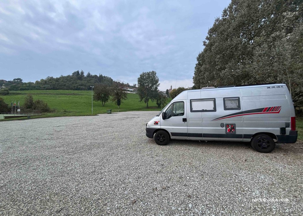 Area comunale su fondo ghiaioso molto comoda. Ci sono i bagni, gli allacci luce e acqua, gli scarichi e i bidoni. Sembra effettivamente lasciata a se stessa, probabilmente fiore all’occhiello di passare amministrazioni. Effettivamente i lampioni non funzionano quindi la notte è buia. Noi abbiamo comunque trascorso una notte fantastica molto tranquilla. Al mattino il risveglio è dato dallo scampanio delle mucche della vicina stalla.