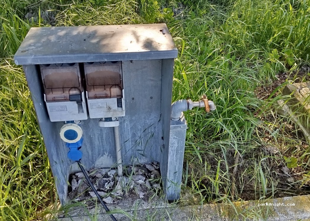 4 palen met elektriciteit, maar geen stroom. Wel bij elke paal water. Grijs water legen kan, staat ook een waterkraan bij. ‘Toiletgebouw’ staat op slot. Wel een heerlijke en vlakke rustige plaats om te overnachten!
