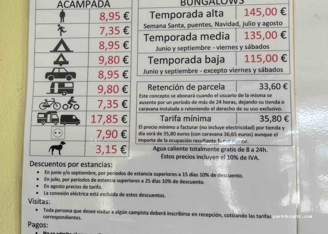 Camping caro 30€ furgoneta dos personas y un perro en Agosto. Parcelas pequeñas y los justo para hacer una parada para asearte y seguir tu rumbo. Los del camping muy secos y lo de la mascarilla brilla por su ausencia. A la noche la gente hasta las 2:30 hablando y haciendo ruido y nadie llama la atencion. No lo aconsejo.