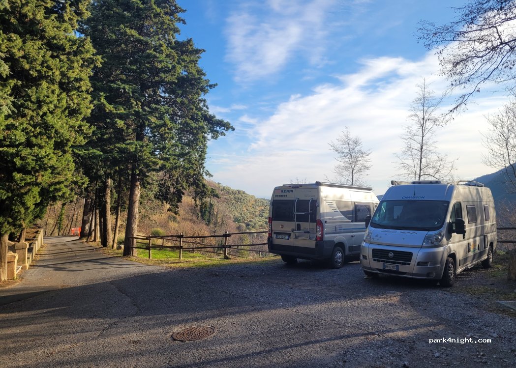Sehr schöner Platz. Ruhig gelegen, ab und zu ein Auto. Auch wir hatten das Vergnügen die beiden großen Hunde zu sehen - sehr freundlich, keine Gefahr ! :)) Platz für zwei Fahrzeuge. Nah der Ruinen von castello dei del carretto - toller Lost Place. Friedhof für Wasser war leider zu.
