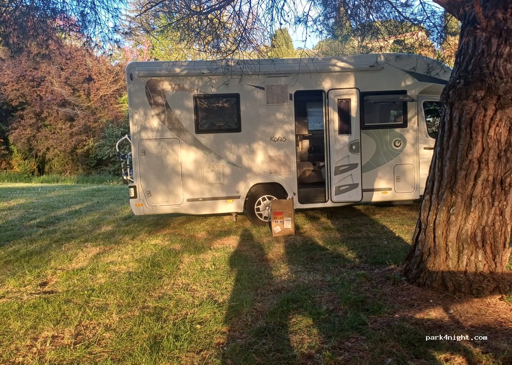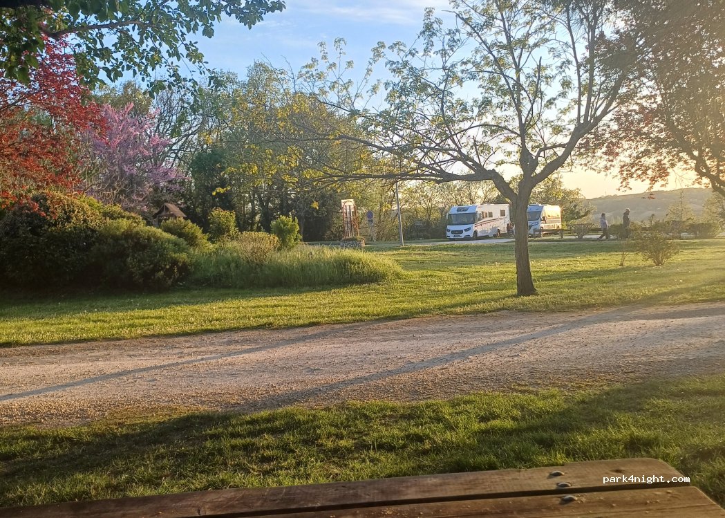 De passage seulement pour une seule nuit fin septembre en semaine le jeudi pour visiter le village médiéval. Nous étions seuls et le terrain est en légère pente qui n'est cependant pas gênante. Nous y avons bien dormi malgré le bruits des véhicules qui passent sur la route assez passante jusqu'à 22h environ et qui le redevient à l'embauche vers 7h30. À 2' à pied du village.