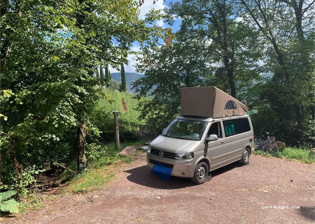 Petit parking dans la forêt au-dessus du village de San Giuseppe. Il y a une place pour quelques voitures. Accès par une route raide et étroite. Près de Kalterer See et Rastenbachklamm