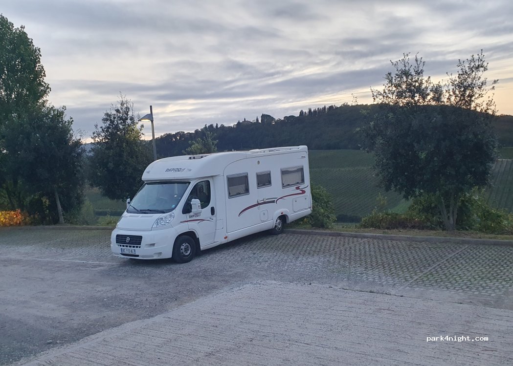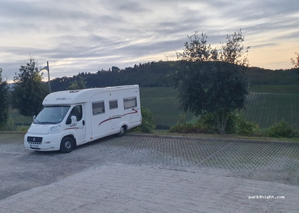 Terraced parking shared with easily accessible cars in a splendid panoramic position with a view of a valley with vineyards and San Gimignano. We spent a very peaceful night. Illuminated present waste bins. Camper Service about 12 km in San Gimignano
