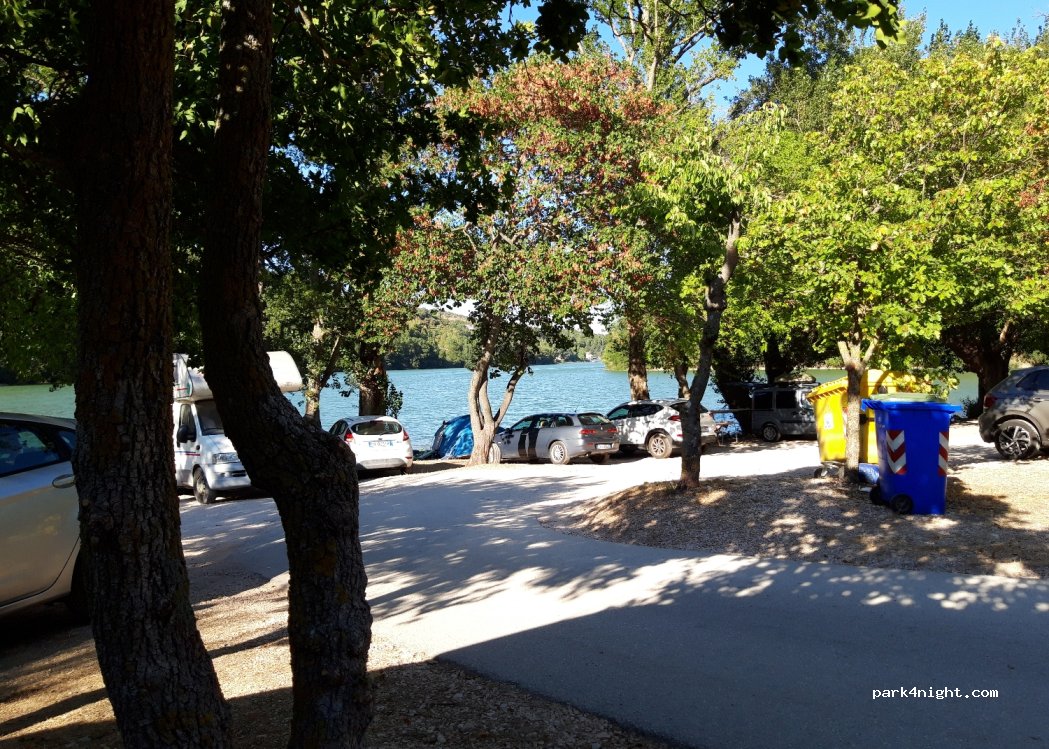 ottimo posto per libera. abbiamo sostato per 24 ore a 10 MT. dalla riva del lago, solo qualche pescatore. il proprietario del locale vicino è gentile e ci ha fatto usare i bagni, in cambio abbiamo comprato degli ottimi salumi e formaggi. consigliato.