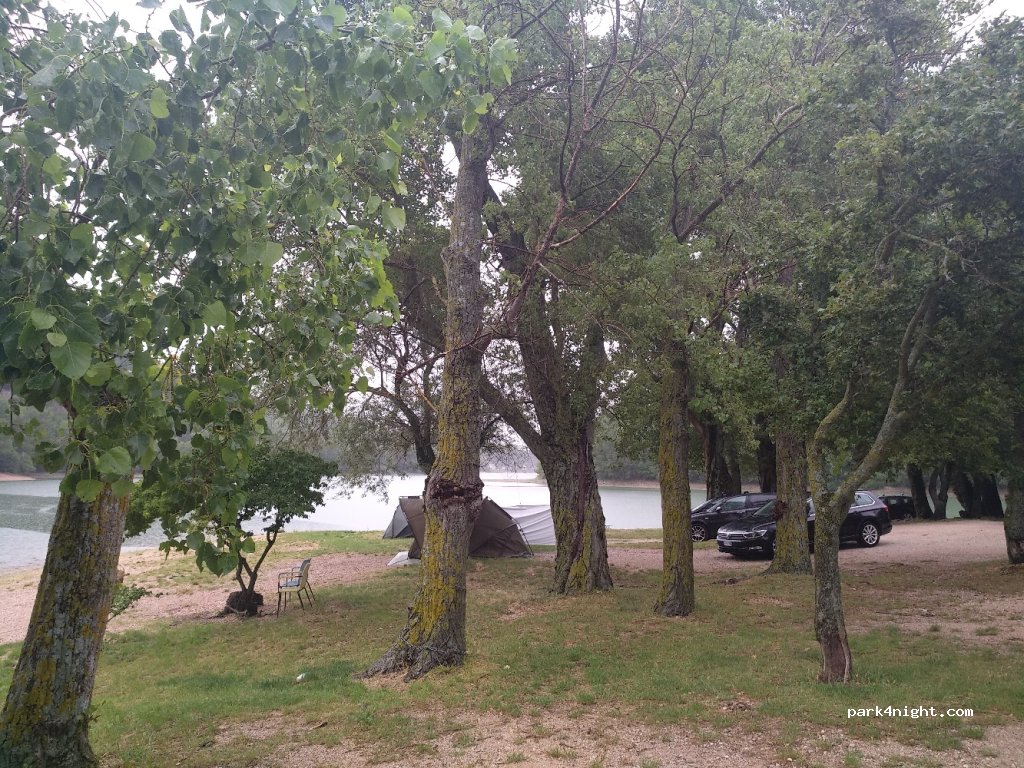 Notte tranquillissima proprio sulle rive del lago, pieno di pescatori in tenda molto silenziosi che facevano avanti e indietro nel lago col gommone a motore elettrico. Il bar ha a disposizione un bagno con doccia al costo di 3€ ad utilizzo ma è fatiscente e sporco, proprio da usare in emergenza. Sosta selvaggia 10€ a notte, se includi il bagno sono 15€. Ci sono di fianco delle vecchissime roulotte parcheggiate abitate da gente poco socievole a cui da fastidio anche la sosta nei paraggi di un furgone, invitandoti ad andare lontano da loro per non rovinargli la vista lago. Il lago in se e per se non è nulla di che. Nessuno faceva il bagno anche se era quasi luglio.