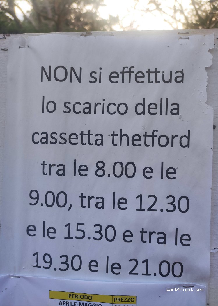 ottima area sosta, ben tenuta, con tessera Acsi 17 euro al giorno a settembre, docce calde 50 centesimi, carico acqua in piazzola, piazzole delimitate da siepi. unico inconveniente è la distanza dal mare e dal centro paese, noi avevamo lo scooter, ma la struttura mette a disposizione una navetta gratuita x le spiagge. Consigliata.