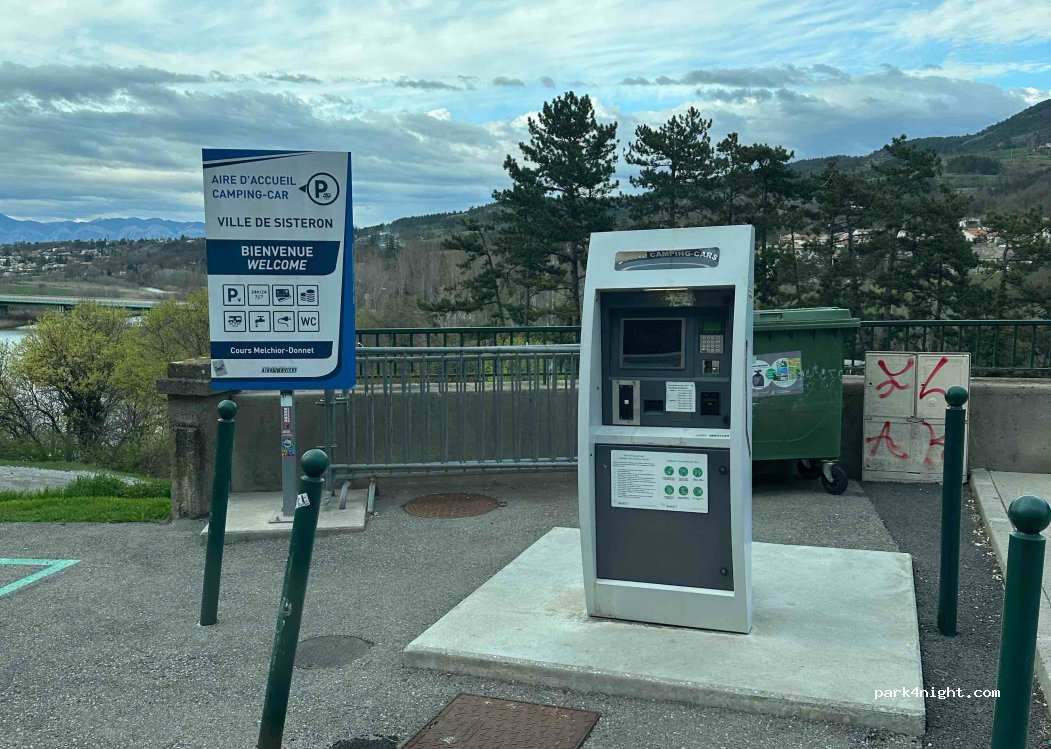Bonjour, le 30/07 on pouvait vider les eaux usées mais pas de remplissage possible. Parking idéal pour visiter Sisteron et sa citadelle, sinon aller au parking de l'école après le pont sur la gauche (15 mns de marche pour rejoindre le centre mais tranquille).