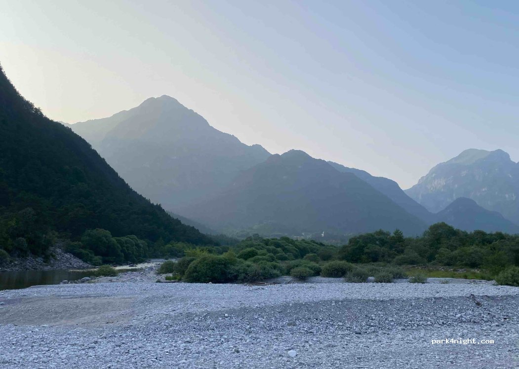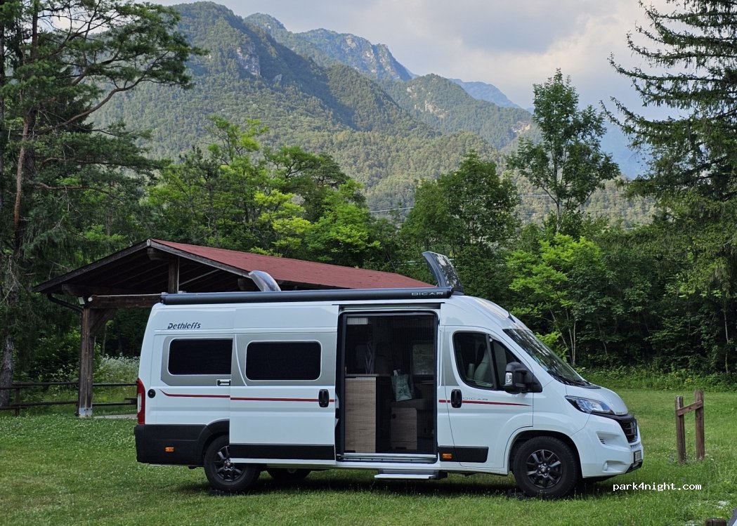 Si può parcheggiare nel bosco, lontano dai punti picnic e barbecue, per 10 euro a notte. Si paga al bar in fondo alla strada. Un luogo incantato, vicinissimo al torrente! Il bar, dotato di ping pong, organizza anche concerti. Presenti diverse fontanelle e bagni