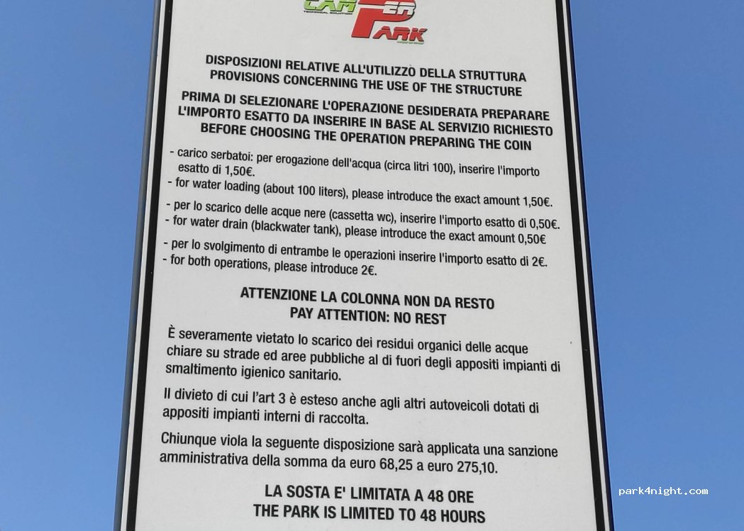 Parcheggio ben posizionato a pochi passi dal centro cittadino, Carrefour di fronte, a bordo parcheggio rivenditore di frutta e verdura. Attenzione, servizi non funzionanti per causa lavori in corso. Tre stelle perché i lavori attualmente sono fermi. Quindi nessuna possibilità di scarico delle acque grigie e nere e nessun carico acque bianche.