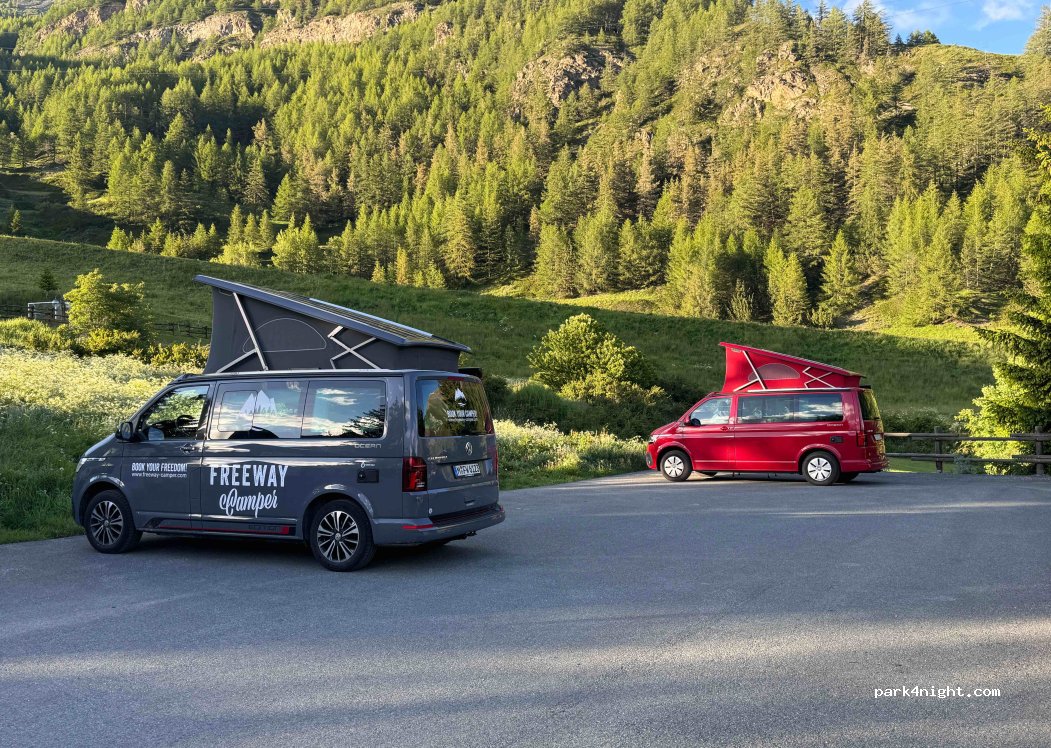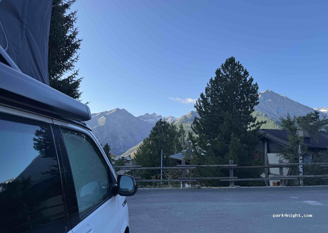 J’ai suivi le GPS et cela passe tout juste avec un van California T6.1, il est préférable de ne pas le suivre ! Parking très proche des habitations, donc soyez très discret. Superbe vue sur les montagnes et WC propre à 100m (sur la plaine de jeux avec table de pic-nic)