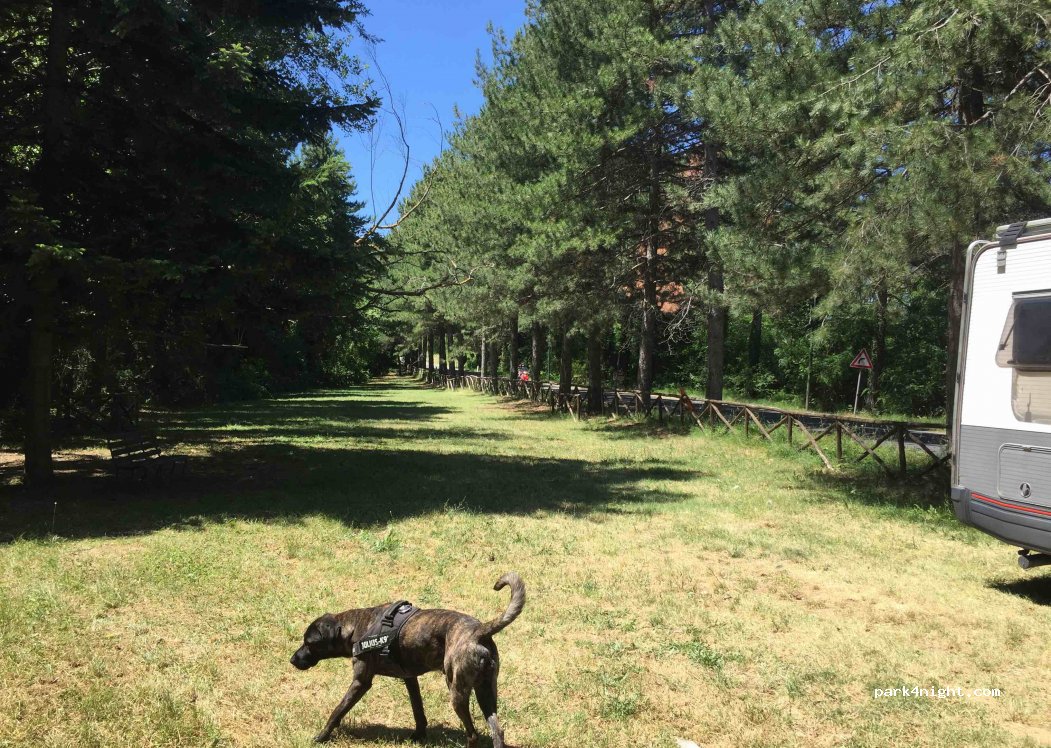 spiazzo in piano su erba alle porte del paese. di fronte c'è un bar aperto fino a sera.